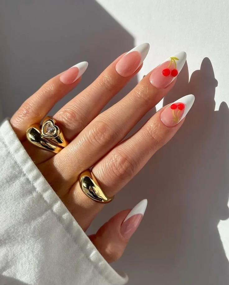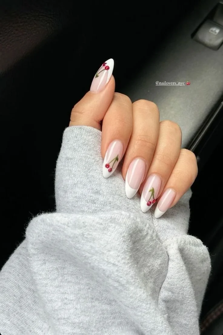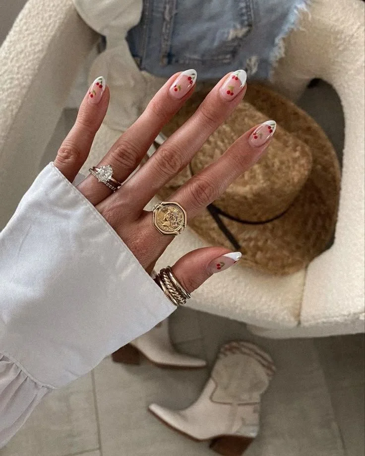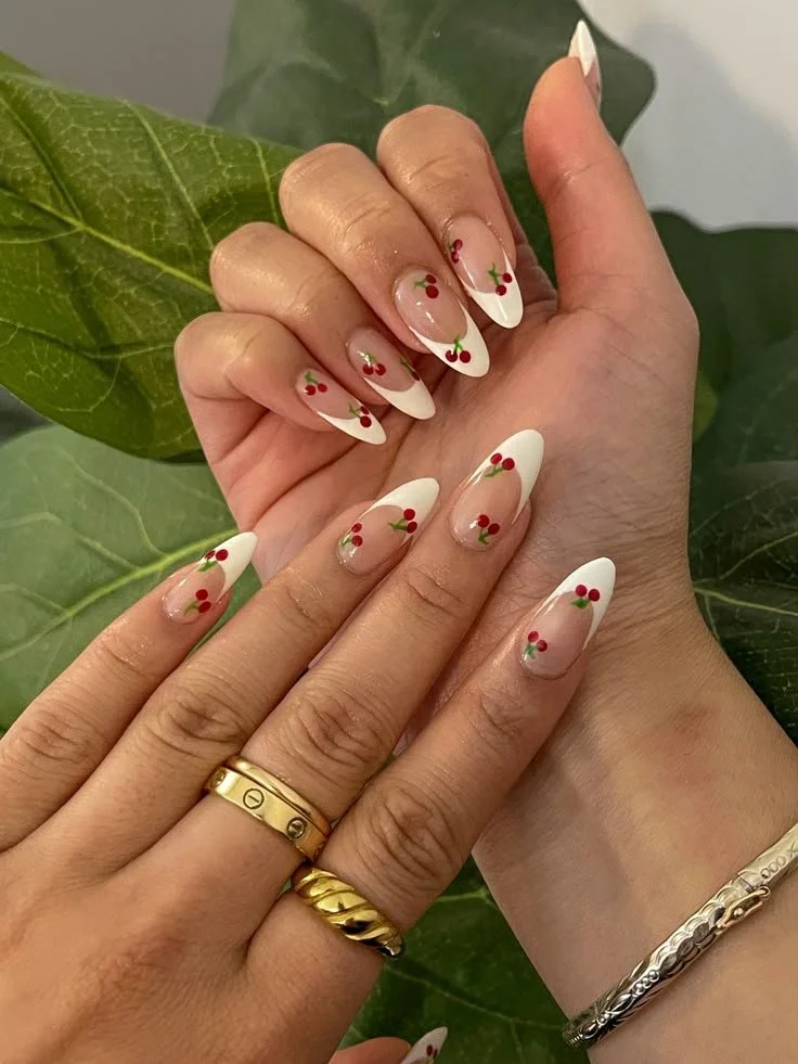 Give your French mani a juicy twist by adding a small cherry at the base of each white tip. Chic, simple, and totally unexpected.
