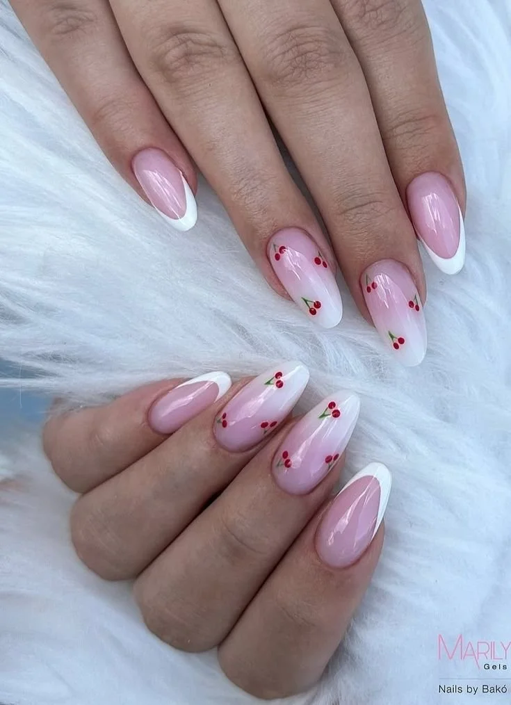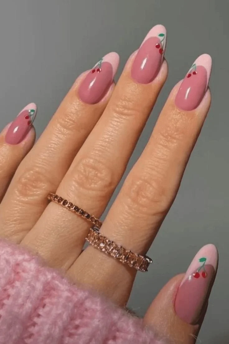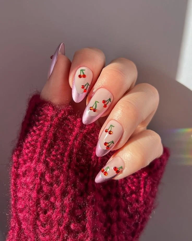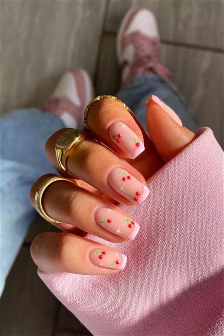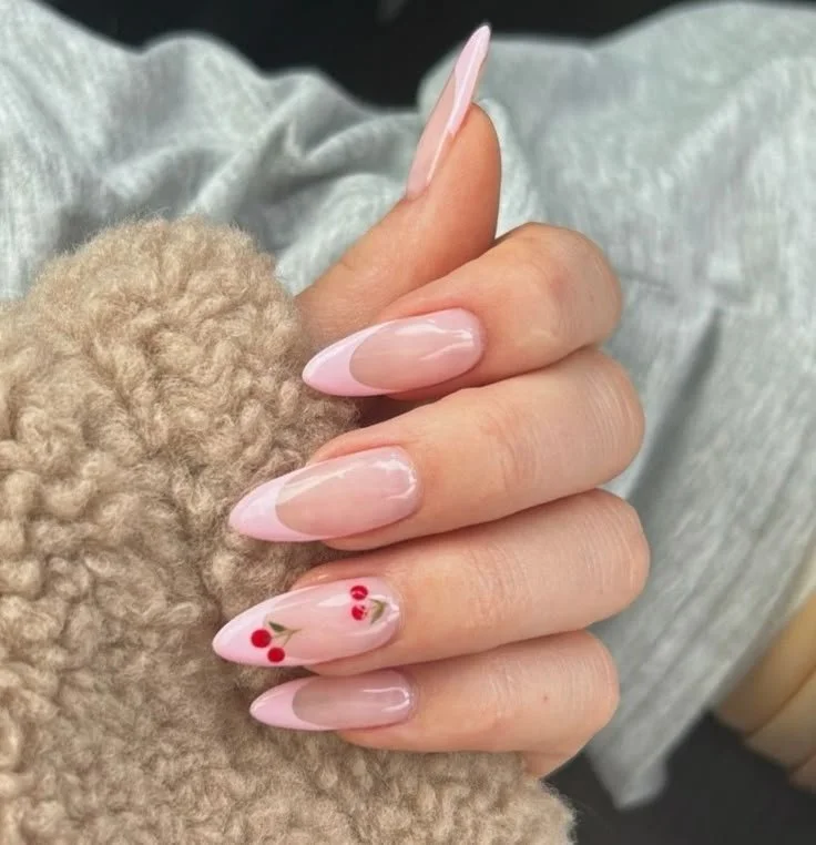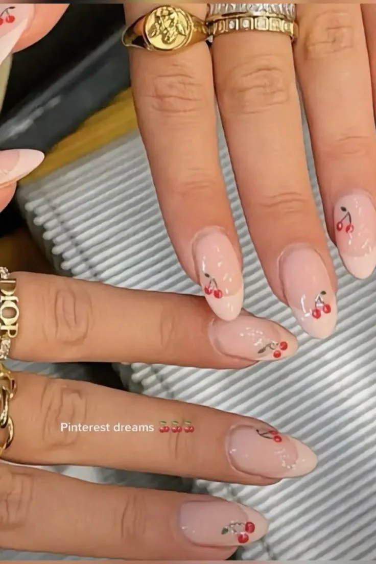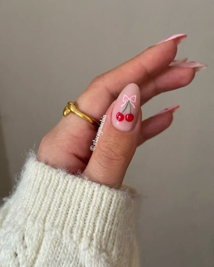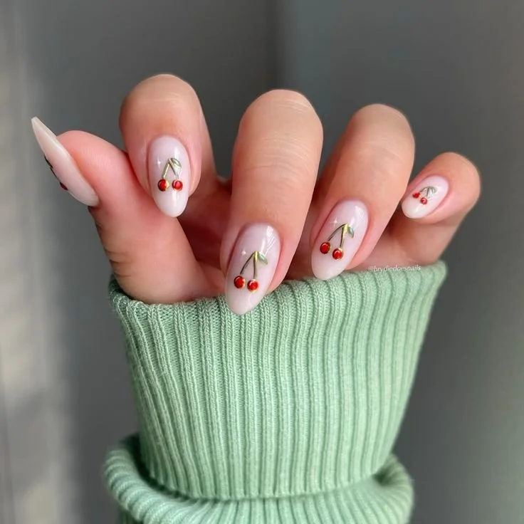 The signature look: tiny red cherry pairs with green stems on a soft, milky pink or nude base. It’s clean, feminine, and looks amazing on any nail length.