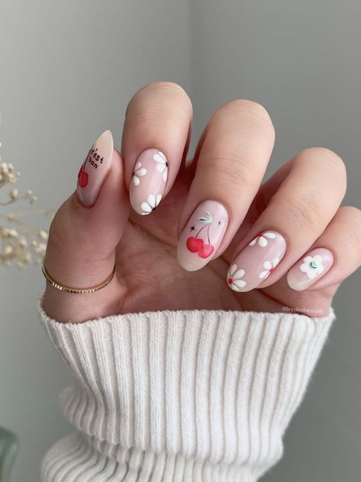 Feeling bold? Cover every nail in mini cherry prints for a wallpaper-like design that pops against a clear or light base.