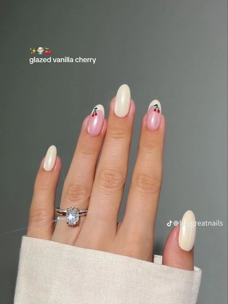 Vanilla chrome nails are having a major moment—and when you add tiny cherry accents, the look becomes instantly irresistible. The soft, pearly chrome base gives off a dreamy, glazed-donut vibe, while the juicy red cherries add a pop of playful color that feels so fresh for summer. If you’re into minimalist nail art with a touch of fun, this trendy cherry nail idea is a must-try. 🍒✨