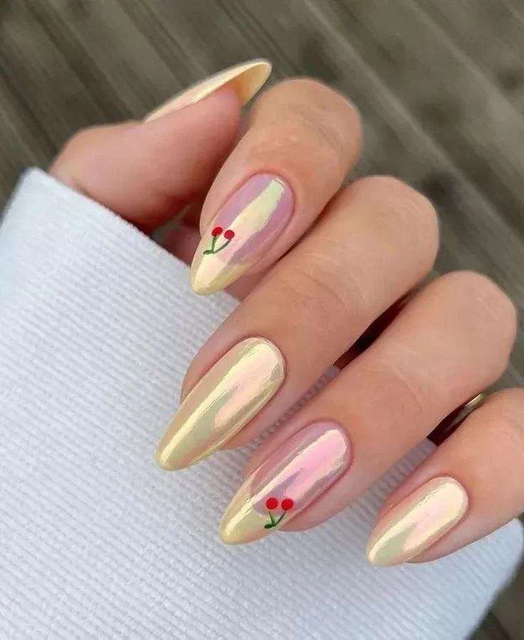 Combine the chrome trend with cherry art by using a pearly pink or silver chrome base. Then, layer on a few tiny cherries for a high-shine, futuristic-meets-retro vibe.