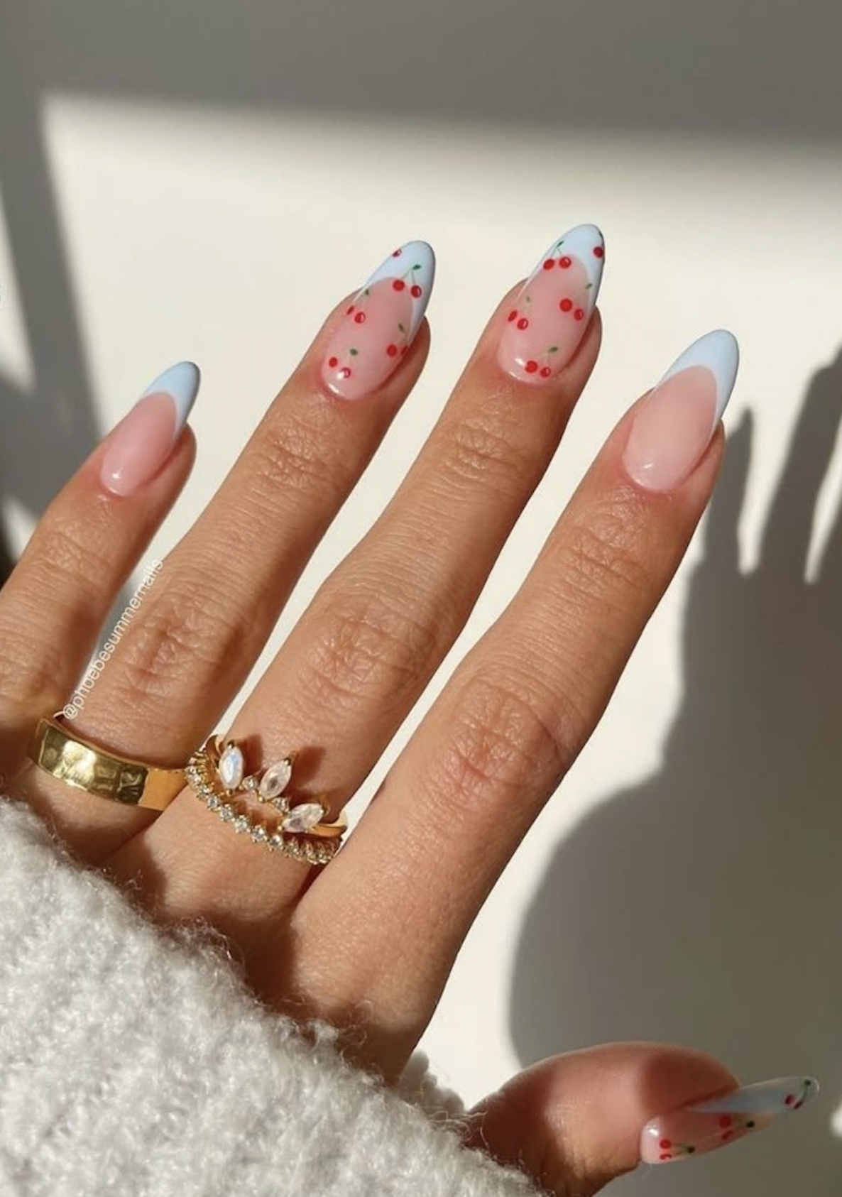 There’s just something about blue nails in summer—especially when you add cherries. A soft sky-blue or baby blue nail base color sets the stage for those bright red cherries to really pop. It’s playful, unexpected, and totally fresh. If you’re into cool tones but still want that sweet, fruity vibe, this combo is your perfect match. 🍒💙